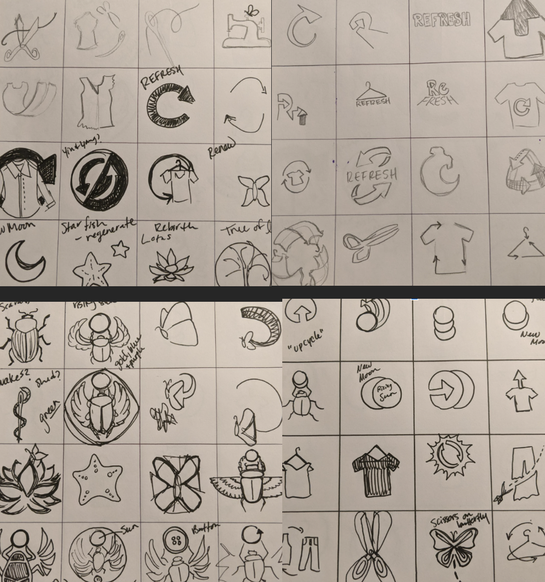 Now that I had a clearer idea of what I wanted to gear my project toward, I began to brainstorm symbology around the ideas of fashion, new life, restoration, and sustainability. In this stage, I conducted further secondary research on the meaning of various symbols. I learned that the scarab beetle is an ancient Egyptian symbol for rebirth and that the starfish coveys regeneration because when they lose a limb, one will grow back in its place. While those were important in my process to learn about, I didn’t feel that they suited the direction I wanted to go. Instead, I found that my strongest sketches were the clothing images with arrows inferring the recycling process and the butterfly and scissors combining transformation and fashion.