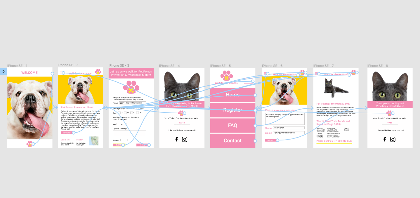 Using the same colors and images as the website, I designed a mockup for a mobile-friendly event sign-up option. At the start of the design is our happy pooch ready to welcome prospective participants to register for the walk-a-thon. After hitting ‘REGISTER’ you are then taken to a curious cat with just a few questions - the same ones you encounter on the website.