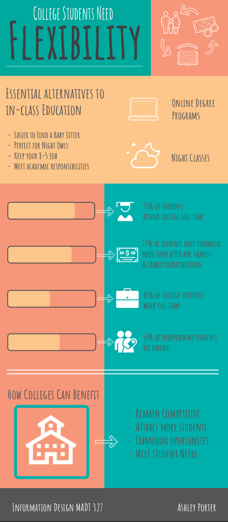 In this information design graphic about college students and flexible learning platforms and options, I aim to visually illustrate the array of choices available to modern students. Through a blend of compelling graphics, and concise data, I highlight the various flexible learning opportunities such as online courses, hybrid programs, and adaptive scheduling. By incorporating eye-catching infographics and pertinent statistics, the graphic will underscore the growing demand for versatile education models among college students. Furthermore, I utilized dynamic visuals to elucidate the benefits and challenges of these different learning pathways, offering a holistic view of the evolving educational landscape for learners.