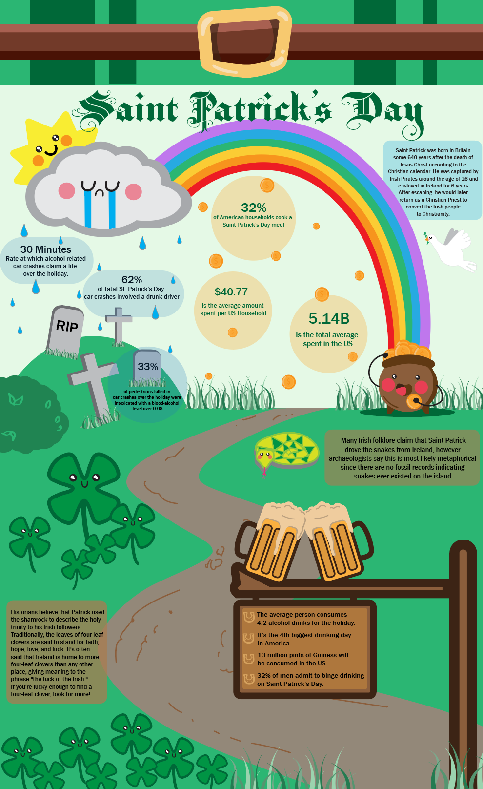This vibrant and engaging infographic aims to transport you to the heart of Saint Patrick's Day celebrations, while not always sunshine and rainbows. Set on a backdrop of lush green, the design draws inspiration from the iconic landscapes of Ireland. The infographic showcases the story of Saint Patrick and the good, bad, and ugly surrounding the holiday.