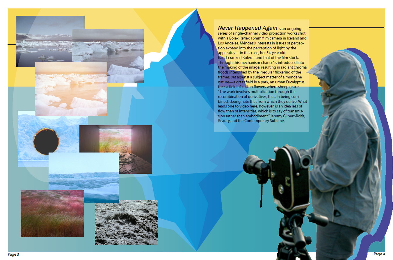 I chose to focus on her Never Happened Again project which is an ongoing series of single-channel video projection works shot with a Bolex Reflex 16mm film camera in Iceland and Los Angeles. This project played a role in my color pallet choices since much of the filming took place in Iceland and around glaciers and icebergs. I designed an iceberg image that would both help to separate and unify both sides of the spread as well as communicate more about the project.