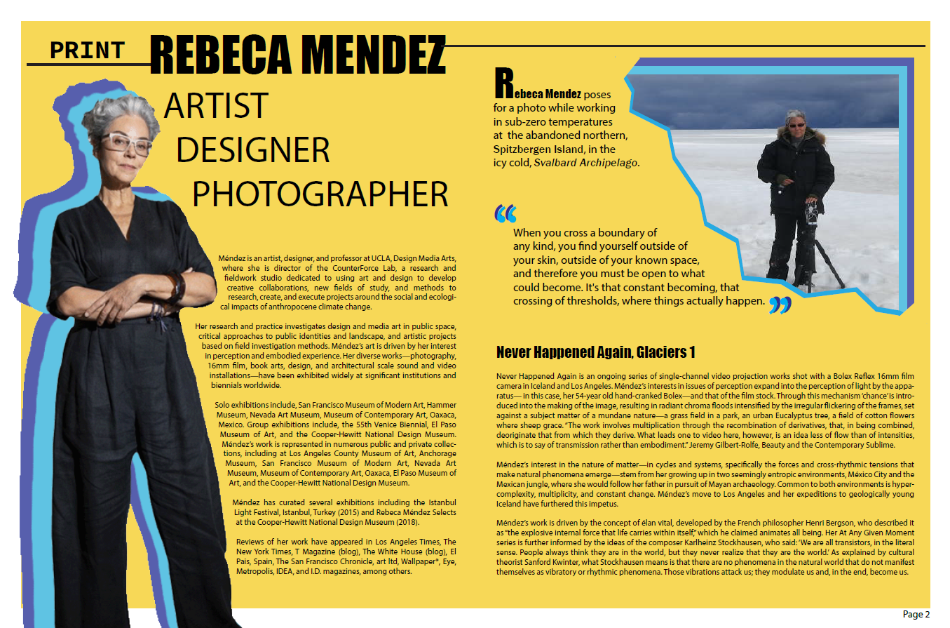 For this project, I chose to do a four-page spread on artist Rebeca Mendez. Rebeca Méndez is a Mexican-American artist and graphic designer. She is a professor at UCLA Design Media Arts in Los Angeles, California, and since July 2020 is Chair of the Department, as well as founder and director of the Counterforce Lab. Her life and work stand as a testament to defying the conventions of graphic design and graphic media fields and expanding the definition of what it means to be a working artist and designer. She has forged her path through punishingly uncharted terrain that’s taken her to the arctic tundras of the earth’s poles, as well as many untamed territories. How could I not choose this 2017 AIGA medalist as my subject of focus?