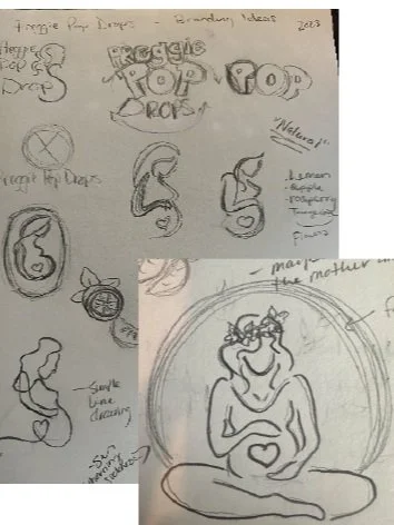 First, I began with sketches re-working the current name and logo “Preggie Pop Drops” but I found that I wanted to connect the logo more to pregnant women in order to help bridge the understanding of what the product is and who it is for. When I think of pregnant mothers, I think of baby bumps and natural curvilinear shapes and so I wanted to reflect those lines in my logo. Ultimately, I ended up going with the enlarged image to the bottom right as my starting point because it is organic and because I placed the heart in her stomach, I feel that it could represent taking care of mom’s health and also baby.